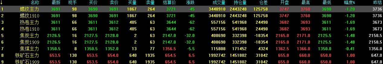 13日螺紋1910收3691跌45,供強需弱的趨勢明顯,預計期螺續跌;熱卷1910收3611跌62,鐵礦石收653.5漲6.5